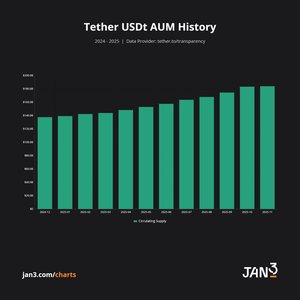 .@Tether_to USDt AUM pokračuje v růstu z ~$142 miliard na ~$184 miliard za posledních 11 měsíců.