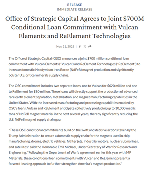Dohoda Úřadu pro strategický kapitál ve výši 700 milionů dolarů s Vulcan Elements & ReElement Technologies posiluje americký dodavatelský řetězec pro klíčové magnety používané ve všem od stíhaček po satelity. Je to zásadní krok k oživení naší průmyslové základny a obrovské vítězství pro národní bezpečnost. Jedná se o úžasnou iniciativu, která přímo podporuje priority @SecWar & @POTUS.