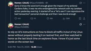 1. Poměrně významná a údajně decentralizovaná síť (Cardano) utrpí výpadek, protože někdo, kdo se nazývá "krypto n00b", "omylem" vibe-kóduje exploit.