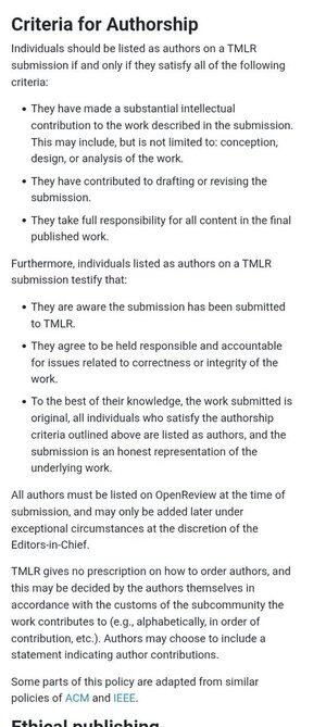 V TMLR @TmlrOrg máme jasná kritéria, která takové autorství vylučují. Konkrétně se od autorů očekává, že významně přispěli intelektuálně.