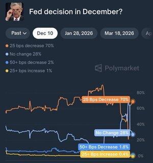 🚨NOVINKY: Celková tržní kapitalizace kryptoměn se drží blízko 2,9 tisíce USD, zatímco pravděpodobnost snížení sazeb Fedu o 25 bazických stop v prosinci vzrostla na 70 % na @Polymarket, což je nárůst z 20 % před čtyřmi dny.