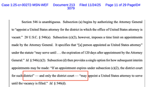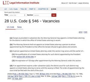 Tady je příslušný zákon. Ustanovení, které opravňuje generálního prokurátora Bondiho jmenovat Lindseyho Halligana na 120denní funkční období jako prozatímního amerického prokurátora, je pododstavec (a). Udělení pravomocí je široké; pokud "okres, ve kterém je volná kancelář státního zástupce Spojených států," může Bondi domluvit jmenování, s JEDINOU uvedenou výjimkou v pododstavci (b). Tento pododdíl zakazuje Bondimu jmenovat někoho, kdo byl Senátem zamítnut.