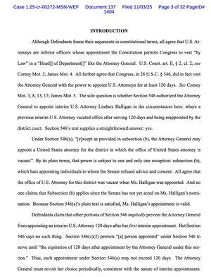 Soudce Currie by si měl být všech těchto bodů dobře vědom. Toto je z úvodu reakce ministerstva spravedlnosti na Comeyho návrh na zamítnutí. Na jediné stránce vysvětluje, proč byl Halligan jasně správně jmenován a proč měl Comey svůj návrh ztratit.