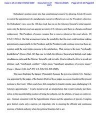 DOJ opět vysvětlilo, proč měl být soudce Currie opatrnější. Jakýkoli výklad zákona, který by dal okresnímu soudu výhradní pravomoc jmenovat amerického prokurátora, naráží přímo na dělbu moci. Státní zastupitelství spadá do výkonné moci.