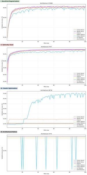 Snažili jsme se být důkladní. Testovali jsme 98 topologií, z nichž mnohé měly konfigurace pro porovnání parametrů (různé rozměry, stejný výsledný počet parametrů). Měřili jsme 3 různé PSA techniky na 3 kontrolách, každá přes 10 studií. Celkem 5 880 pokusů. Reprodukovatelný.