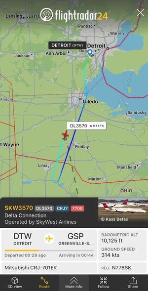 #DL3570 z Detroitu do Greenville-Spartanburg, otočila se zpět směrem k Detroitu, zakřičela 7700 a klesla na 10 000 stop. Sestup do výšky 10 000 stop často naznačuje problém s tlakem kabiny.