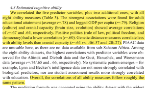 Rindermann publikoval nový článek, který opět ukazuje, že národní odhady IQ jsou robustní. Ať už někdo používá IQ nebo různé studentské úspěchy, korelace s dalšími proměnnými, jako je kapacita lebky, náboženství, vzdělání, genetická vzdálenost, vykazuje podobné vzorce.