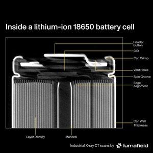 Zde je průřez vysoce kvalitním válcovým článkem, abyste si udělali představu o konzistentním převisu mezi anodou a katodou, který bychom očekávali u dobré baterie. Pokud se chcete dozvědět více o kvalitě lithium-iontových baterií, podívejte se na toto vlákno: