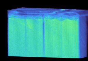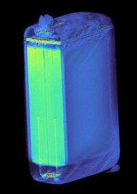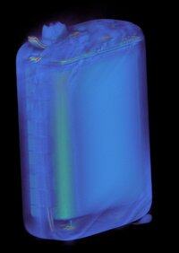 Pouzdro powerbanky obsahuje dva lithium-iontové pouzdrové články. V tomto @lumafield CT skenu můžeme odstranit plastový obal s nižší hustotou a izolovat elektroniku banky a vedle sebe položené bateriové články.