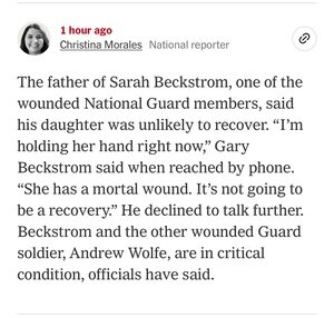 Členka Národní gardy Sarah Beckstromová, která byla včera postřelena poblíž Bílého domu ve Washingtonu, D.C., podle jejího otce pro New York Times pravděpodobně nepřežije. "Držím ji za ruku. Má smrtelnou ránu. Nebude to žádné zotavení."