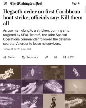 WASH POST: "Když se dva muži drželi poškozené, hořící lodi zaměřené SEAL Team 6, velitel společných speciálních operací poslechl Hegsethův rozkaz nezanechat žádné přeživší."