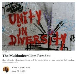 "Snadno si uvědomujeme nebezpečí silné skupinové identity, když podporuje krajně pravicová hnutí, přesto tento poznatek záhadně mizí, když se stejné dynamiky objeví i v migrantských nebo menšinových komunitách. Tato slepá skvrna odráží základní krédo multikulturalismu: ušlechtilé úmysly a morální rétoriku spojené s naprostým ignorováním skutečných výsledků."