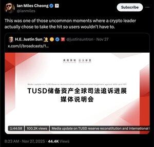 proč Ian Miles Cheong a účet "Not Elon Musk" (1,2 milionu a 1,6 milionu sledujících) propagují Justin Sunův "záchranný balík TUSD"?