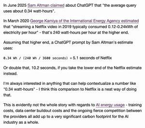 Ze zvědavosti jsem se rozhodl zkusit spočítat, kolik Netflixu můžete sledovat za energii na zadání ChatGPT Pokud vím, je to mezi 5,1 a 10,2 sekundami, v závislosti na tom, na které straně odhadu spotřeby energie IEA Netflix z roku 2019 použijete