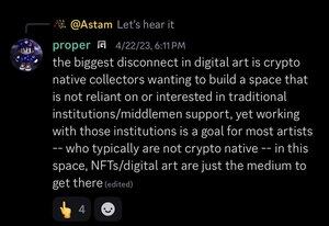 "Tradiční" umělci chtějí to, co vždy chtěli – institucionální podporu + potvrzení a zviditelnění sběratelů, kteří působí mimo logiku boomu a krachu kryptotrhů. Chtít vystavovat na Art Basel, Benátském bienále, MoMA nebo být prodáván na Sotheby's není zradou krypta, je to prostě realita toho, jak se kulturní kapitál stále přiděluje. Viditelnost ve světě umění není určena Discord serverem, chatem na Telegramu nebo Twitterovou ozvěnovou komorou.