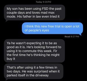 "Poprvé si myslí, že by si to mohl koupit (FSD). Byl překvapený, když se auto samo zaparkovalo na příjezdové cestě."