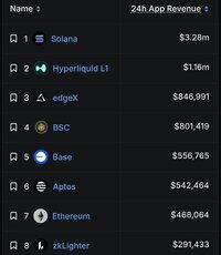 🚨 @solana dominuje tržbám z aplikací 24 hodin denně, generuje téměř o 3× více než druhý největší řetězec Hyperliquid.