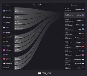Monad je v provozu už týden. Takto vypadal pohyb do řetězu na Mayan. 🟪 55,5 milionu dolarů+ přemostěné. 🟪 22 % celkového objemu, což dělá z Monadu #2 cílový řetězec. 🟪 Největší přílivy pocházely z Etherea, Arbitrum, Solany a Base.