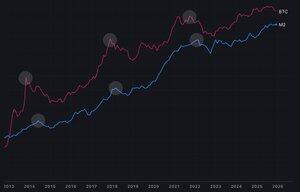 Historicky měly BTC vrcholy v globálním M2 nárůsty vedoucích poklesů.