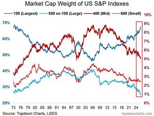 Současná koncentrace trhu je bezprecedentní: Největších 100 společností nyní představuje ~68 % celkové tržní kapitalizace USA, což je nejvyšší hodnota od 70. let. Toto procento vzrostlo za posledních 20 let o +23 bodů. Současně index S&P 500 bez top 100 klesl o -16 procentních bodů na ~25 %, což je nejnižší hodnota za nejméně 52 let. Pro srovnání, 400 středně velkých akcií nyní tvoří ~5 % celkové tržní kapitalizace, což je pokles o -4 body za posledních 14 let. A přitom váha 600 akcií malých společností klesla na ~2 %, což je téměř minimum od doby dot-com bubliny v roce 2000. Velké společnosti s velkou kapitalizací nikdy nebyly větší.
