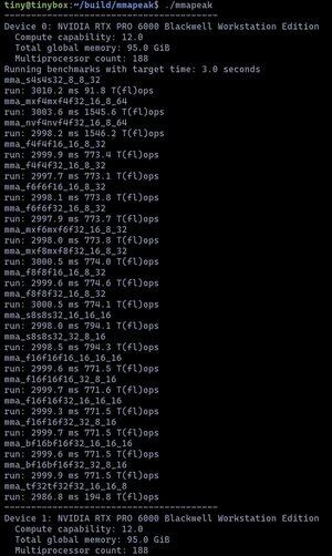 Zatímco čekáme na GPU fritézu, tady je mmapeak. **3.1 PFLOPS** přes karty fp16 -> fp32. Tady je absence nerfování 5090 opravdu výrazná, je to více než dvojnásobek surových FLOPS oproti tinybox green v2!