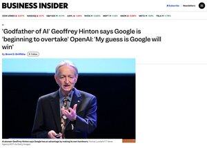 Nálada vůči OpenAI roste každý den: "Myslím, že právě teď ho začínají předjíždět," řekl Hinton o pozici Googlu vůči OpenAI. (...) "Myslím, že je vlastně překvapivější, než trvalo tak dlouho, než Google předstihl OpenAI," řekl Geoffrey Hinton, emeritní profesor na Torontské univerzitě, který dříve pracoval v Google Brain, v úterním rozhovoru pro Business Insider.
