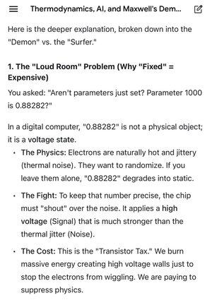 S AI hrajeme démona, když nutíme tranzistory do pevných stavů jen proto, aby udržely jeden parametr. Každé je číslo mezi 0 a 1. Při tom spalujeme obrovské množství energie, abychom bojovali proti entropii a udrželi tato specifická čísla