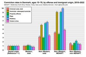 Míra odsouzení v Dánsku, klasifikovaná podle původu a kategorie trestné činnosti.