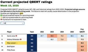 Mahomesova a Lamar Jacksonova QBERT sledovanost oba klesají. Jackson od návratu po zranění sotva překonal úroveň náhradníka. Mahomes je *dobrý*, ale jak podlaha, tak strop jsou nižší než před pár lety.