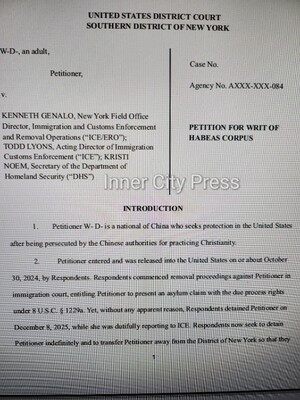 ICE BEAT: Žena z Číny zadržena ICE 8. prosince podala následující den žádost o habeas corpus v roce @SDNYLIVE s odvoláním na křesťanství a bití čínskými úřady – článek Inner City Press