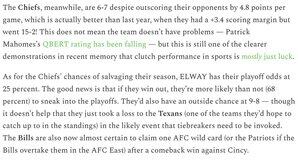 Co se týče Chiefs, ti mají na 25 % šancí na postup do play-off. Stále favorité *podmínění vítězstvím*, ale jejich rozstřel není příliš příznivý.