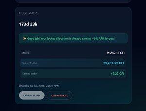 Jak to funguje: • Při spuštění: 1 xCFI = 1 $CFI • Odměny zvětšují velikost $CFI fondu • zásoba xCFI zůstává pevná • Každý xCFI tedy kontinuálně představuje více $CFI v průběhu času Aktuální APR je 9 % a hodnotu svého xCFI můžete vidět na portálu, kde jste stakovali $CFI.