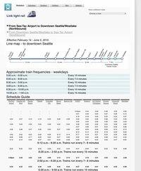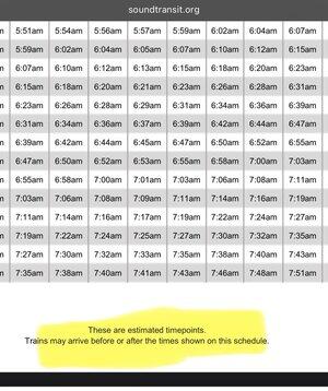 Als die Seattle Light Rail begann, gab es an Wochentagen und am Wochenende alle 8-12 Minuten einen Service, der zu bestimmten Minuten zur vollen Stunde geplant war. Es wurde am Bahnhof ausgedruckt.