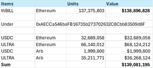 A) thBILL Umlauf: 137.375.803 (0x5FA487BCa6158c64046B2813623e20755091DA0b), bewertet mit $138.896.828, basierend auf dem im Vertrag lesbaren Preis 1.011072, Marktpreis leicht höher.