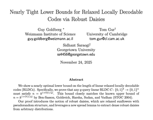Ich freue mich, neue Arbeiten mit dem brillanten Guy Goldberg und Sidhant Saraogi (jetzt auf dem Arbeitsmarkt!) zu teilen. Wir beweisen nahezu enge untere Schranken für entspannte LDCs durch ein neues Konzept von entspannten Sonnenblumen mit pseudorandom Struktur, die aus neuen Verbreitungslemmas gewonnen wurden.