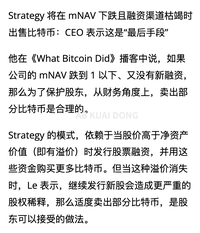 Erstmals anerkannt, dass der Verkauf von Bitcoin in Betracht gezogen wird. Der derzeitige CEO von MicroStrategy, Phong Le, erklärte, dass das Unternehmen plant, Bitcoin zu verkaufen, wenn der Aktienkurs unter den mNAV fällt und die Finanzierungsmöglichkeiten erschöpft sind. Er stellte klar, dass dies eine rein finanzielle Entscheidung ist; als Bitcoin-Reserveunternehmen möchte man BTC nicht unbedingt verkaufen, aber wenn der Markt schlecht ist, müssen finanzielle Entscheidungen über Emotionen gestellt werden. Derzeit muss Strategy jährlich 750 bis 800 Millionen US-Dollar an festen Dividenden an die früheren Investoren der Vorzugsaktien zahlen (das Unternehmen hatte damals durch die Ausgabe von Vorzugsaktien mit festem jährlichem Zinssatz Kapital beschafft, um BTC zu kaufen, was dazu führte, dass das Unternehmen jährlich große Summen aufbringen muss, um diese Verpflichtungen zu erfüllen). Früher hat das Unternehmen bei einem mNAV-Überhang immer Aktien ausgegeben, um diese Dividenden zu zahlen, aber nachdem der mNAV von Strategy unter 1 gefallen ist, werden die Zweifel am Markt immer lauter, und der eigene Aktienkurs ist ebenfalls ständig gefallen. Zusatz: mNAV ist ein Maß für den Unternehmenswert und den Wert der gehaltenen Token. Wenn er unter 1 fällt, bedeutet das, dass der Gesamtwert des Unternehmens unter dem Wert der gehaltenen Token liegt.