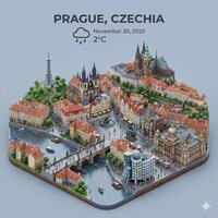 Präsentieren Sie eine klare, 45°-Top-Down-isometrische Miniatur-3D-Cartoon-Szene von [CITY], die ihre ikonischsten Wahrzeichen und architektonischen Elemente zeigt. Verwenden Sie weiche, raffinierte Texturen mit realistischen PBR-Materialien und sanfter, lebensechter Beleuchtung und Schatten. Integrieren Sie die aktuellen Wetterbedingungen direkt in die Stadtumgebung, um eine immersive atmosphärische Stimmung zu schaffen.