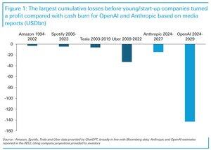 Wilder Chart von Jim Reid bei Deutsche Bank, der zeigt, wie viel OpenAI voraussichtlich verbrennen wird, bevor es profitabel wird. Ein paar Dinge stechen ebenfalls hervor: Wie gering der $AMZN-Verlust in den ersten 8 Jahren wirklich war. Wie groß der $UBER-Verlust war, bevor es letztendlich in die Gewinnzone kam.