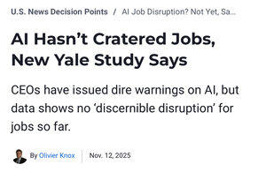 Tatsächlich hat eine neue Studie des Yale Budget Lab ergeben, dass KI basierend auf 33 Monaten Daten nach der Veröffentlichung von ChatGPT "keine erkennbare Störung" auf dem Arbeitsmarkt verursacht hat.