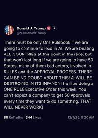 Donald Trump sagt, dass er diese Woche eine Exekutive Anordnung unterzeichnen wird, die die Fähigkeit der Bundesstaaten einschränken wird, KI zu regulieren.