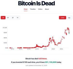 Bitcoin ist tot... schon wieder ☠️ $BTC ist anscheinend 450 Mal gestorben. Ökonomen, Journalisten, Vermögensverwalter, größtenteils brillante Menschen haben seit seiner Entstehung selbstbewusst sein Begräbnis erklärt. Und doch driftet das Diagramm weiter nach oben und nach rechts. Wenn du jedes Mal, wenn jemand #Bitcoin für tot erklärt hat, 100 $ investiert hättest, würdest du heute 91 Millionen $ besitzen. Lass das mal sacken.....