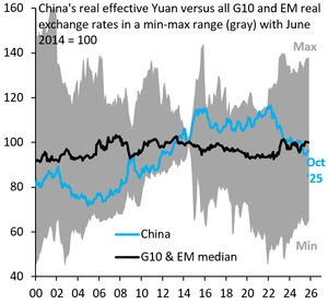 Der RMB Chinas ist mindestens um 20 % unterbewertet. Der einfachste Weg, dies zu erkennen, ist, dass der reale effektive RMB (blau) seit 2022 um 20 % gefallen ist, während Chinas Handelsüberschuss massiv gestiegen ist. Chinas Merkantilismus beruht auf dieser Unterbewertung und der Industriepolitik...
