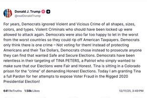 Trump: Tina sitzt in einem Gefängnis in Colorado für das "Verbrechen", ehrliche Wahlen zu fordern. Heute gewähre ich Tina eine vollständige Begnadigung für ihre Versuche, Wahlbetrug bei den manipulierten Präsidentschaftswahlen 2020 aufzudecken!