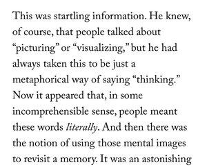 Sono una di queste persone senza immagini mentali e ricordo di essere rimasto scioccato quando ho realizzato che quando le persone dicono di "immaginare" le cose — non è solo una metafora.