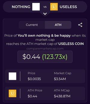 If $NOTHING(@youllownnothing) reaches $USELESS's ATH market cap, its price would be $0.44. That makes 123x!