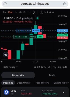 Ok, he entrado en otro corto de $LINK en @infinex, con stops ajustados, veamos si puedo sacar unos cientos de dólares de beneficio para alcanzar los $1500 en el día.