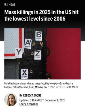 Los asesinatos masivos en EE. UU. están en su nivel más bajo desde 2006 - casi un mínimo de 20 años. El liderazgo importa. @realDonaldTrump empoderando a las fuerzas del orden en todo el país para que hagan su trabajo y detengan los asesinatos ANTES de que ocurran. Vidas que se salvan cada día gracias a ello. Y tenemos más por hacer.