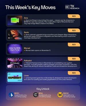 🔑 Eventos clave de esta semana 1️⃣ @zora | Zora Live Stream se lanzará esta semana, > los espectadores pueden dar propina a los streamers en $ZORA para obtener recompensas en tiempo real. Este modelo ofrece un mayor potencial de retorno de la inversión y puede ayudar a los creadores de Web2 a conectar la Web3 2️⃣ @SonicLabs | La actualización de la red principal de Sonic brinda interacciones de dApp más fluidas y baratas, junto con una integración más fácil de Ethereum y el reparto de tarifas, lo que podría impulsar un mayor desarrollo de aplicaciones 3️⃣ @monad | El reclamo de Monad se abre hoy 4️⃣ @Polkadot | Polkadot Hub tiene como objetivo reducir los costos de transacción y agilizar el desarrollo 5️⃣ @LineaBuild | Linea Exponent se lanzará el 5 de noviembre, diseñado para recompensar a los desarrolladores y usuarios por crear y escalar aplicaciones en la red Linea 🔓 Desbloqueos de tokens de clave 1️⃣ $SPEC: 3,62 millones (~11,24% de su suministro circulante) 2️⃣ $ENA: 40,63 millones (~0,6% de su suministro circulante) 3️⃣ $MOVE: 50 millones (~1,82% de su suministro circulante)
