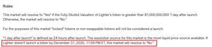 No es que no esté seguro de que el FDV de Lighter alcance 1.000 millones, pero la fecha de liquidación de este mercado Polymarket es el 31 de diciembre. Si Lighter tuviera un TGE en enero del año que viene, el mercado habría decidido que no era para entonces, la fecha de liquidación habría pasado, una trampa pura del tiempo.