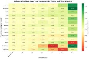 Top 15 operadores mensuales de Polymarket en PNL por volumen ponderado por el movimiento medio de la línea post-ejecución por marco temporal (05/11-11/13)